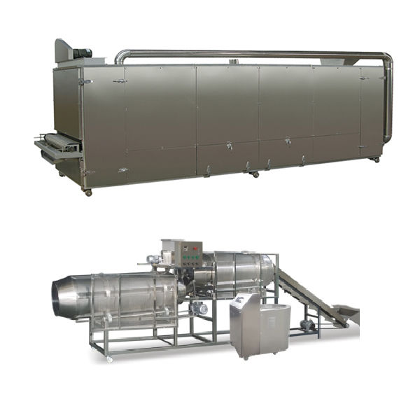 mixer→screw conveyor→twin screw extruder→air conveyor→dryer→hoister→flavoring drum and oil sprayer→cooling machine→packing machine